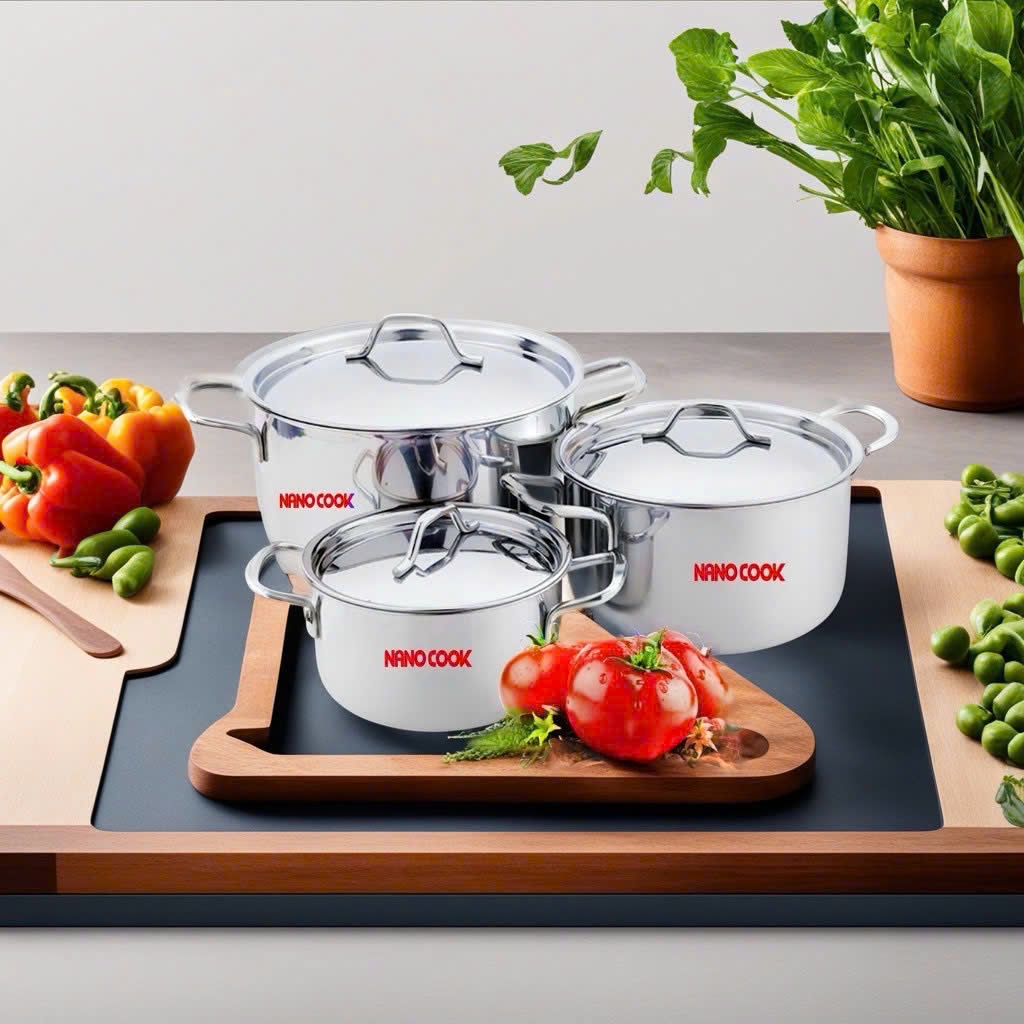 Chảo lẩu inox hai quai 3 đáy+ nắp kính, lòng trong inox Nanocook