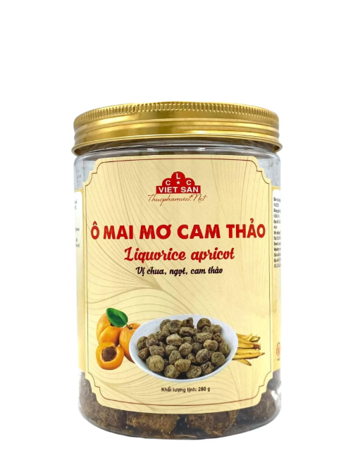 Ô Mai Mơ Cam Thảo Việt San Hộp 280g là sản phẩm được chế biến từ những quả mơ chín kết hợp với đường, muối và cam thảo tạo nên hương vị đặc trưng của ô mai.